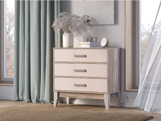Комод «Скандика» КМ-01 с тремя ящиками подойдет и для спальни, и для гостиной, и для детской. В ящиках с удобными геометрическими ручками удобно хранить постельное белье и одежду.