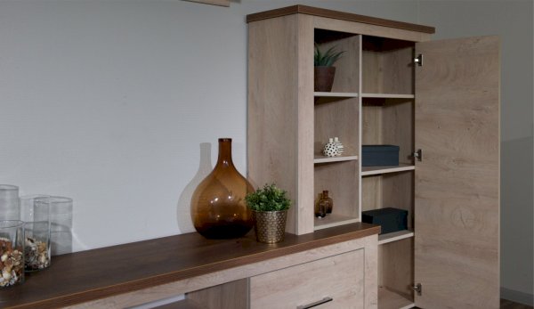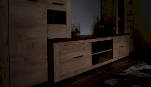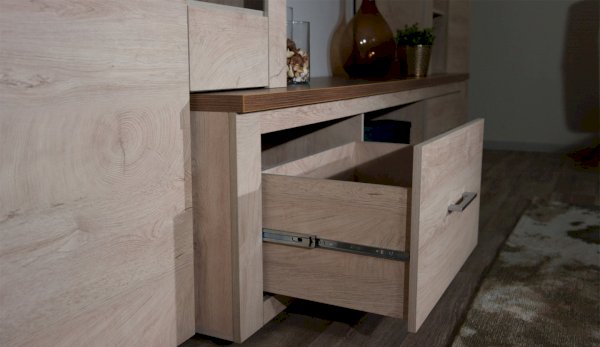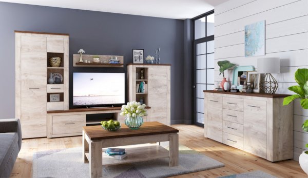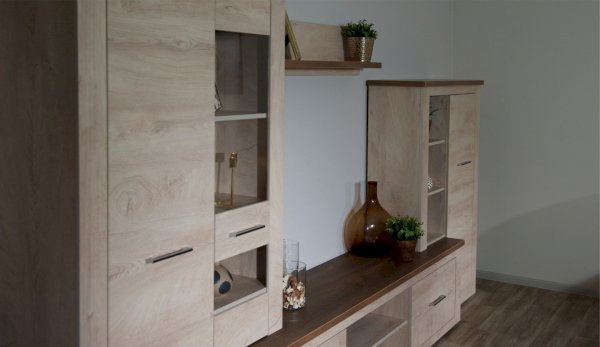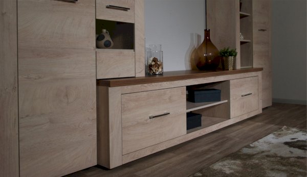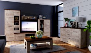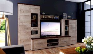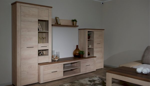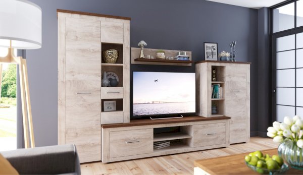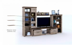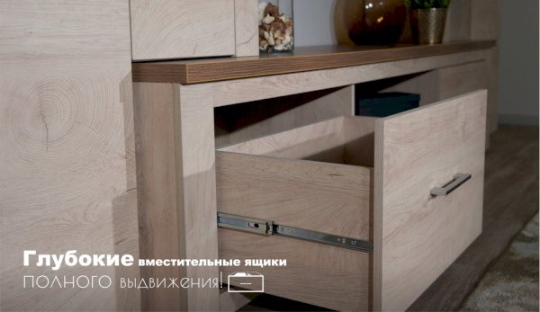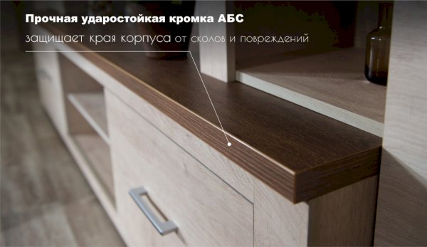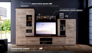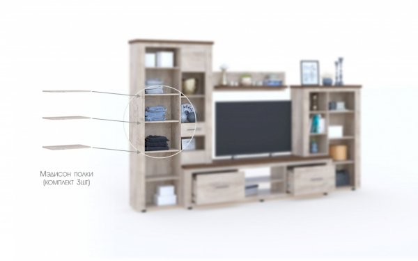 Стенка Мэдисон - это готовое решение для гостиной в современном европейском дизайне. Покрытие из ЭКОшпона повторяет фактуру и рисунок натурального дерева, устойчиво к износу. Крышки стенки, полки и ниша под телевизор выполнены из утолщенной плиты с мягкими безопасными краями. Мебель выполнена из экологически безопасных материалов.