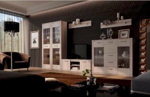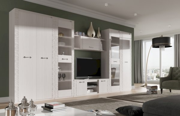 Гостиная «Элана» обязательно покорит любителей минимализма и сторонников практичности, ведь она может комплектоваться по Вашему желанию различными шкафами достаточной вместимости и полками, на которых удобно разместятся и важные мелочи, и элементы декора. Располагаться элементы гостиной «Элана» могут различным образом, что придаст помещению, в котором она будет находиться, неповторимый вид. Дополнительно к основным модулям гостиной «Элана» рекомендуется приобрести полку «Лаго», один из вариантов журнальных столиков, а также добавить романтики в обычный вечер с помощью специальной светодиодной подсветки, которая может быть расположена в стеклянных полках.