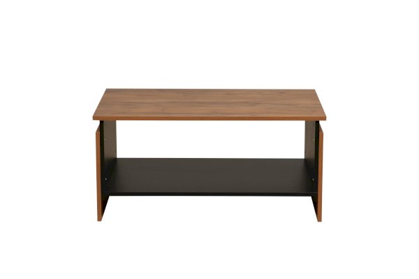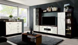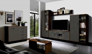 Журнальный стол, в отличие от других корпусных модулей, выполнен в одном цвете – таксония. Поэтому он выделяется на их фоне и привлекает к себе внимание. Такой столик нужен обязательно! На боковых стенках-опорах сделаны накладки, которые придают внешнему дизайну эффект 3-Д, поскольку панели находятся на разных уровнях.