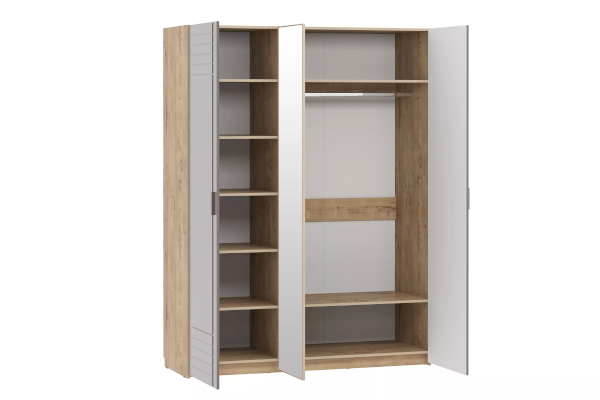 С комбинированным шкафом Livorno НМ 013.57 Х в спальне не придется устанавливать дополнительную мебель для хранения одежды. В левой части модуля находится секция с пятью полками для белья. Правую часть шкафа занимает отделение с овальной штангой, которая способна выдержать много тяжелой верхней одежды. Антресольная полка подходит для хранения объемных вещей, а нижняя полка – для размещения коробок с обувью. Зеркальный фасад расширяет функционал шкафа и увеличивает пространство комнаты.
