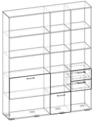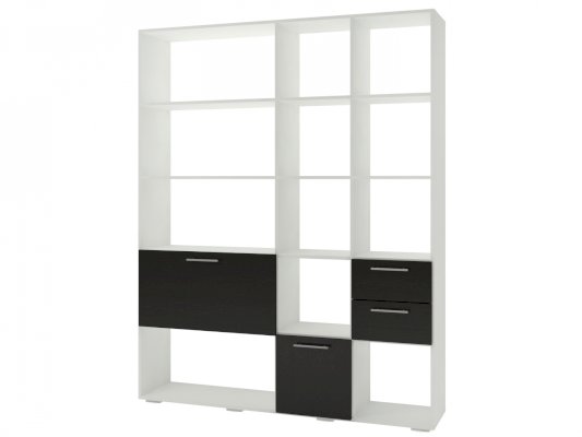 Применение задней стенки из ЛДСП (в ячейках с ящиками и фасадами) позволяет использовать данный стеллаж для зонирования пространства (чтобы предотвратить опрокидывание, необходимо обеспечить крепление стеллажа к стене).