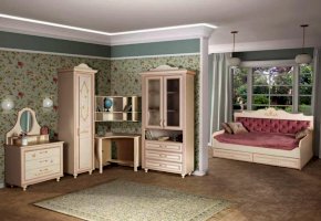 Мебель для детской комнаты «Алиса» – мебель для девочек и девушек, стилизована под Прованс, который поддержан светлым декором, цветочными рисунками и патиной на фасадах. При создании детской использовались приемы итальянского декорирования мебели. Мотивы классической росписи в сочетании с любимым мотивом детского рисунка – бабочки и цветы – создают ощущение юности и нежности. Использование декоративных элементов – корон и карнизов в наборе мебели не перегружают интерьер детской комнаты и при этом создают ощущение интерьера маленькой принцессы. Изящные ручки под золото со вставками молочно-белого цвета идеально сочетаются с кремово-белым декором и золотистой палитрой рисунков вензелей. При всей внешней легкости и утонченности мебель весьма практична в использовании, благодаря надежной фурнитуре «Hettich». Еще одним плюсом детской «Алиса» является большое количество различных модулей, позволяющих собрать комплект для любой комнаты.